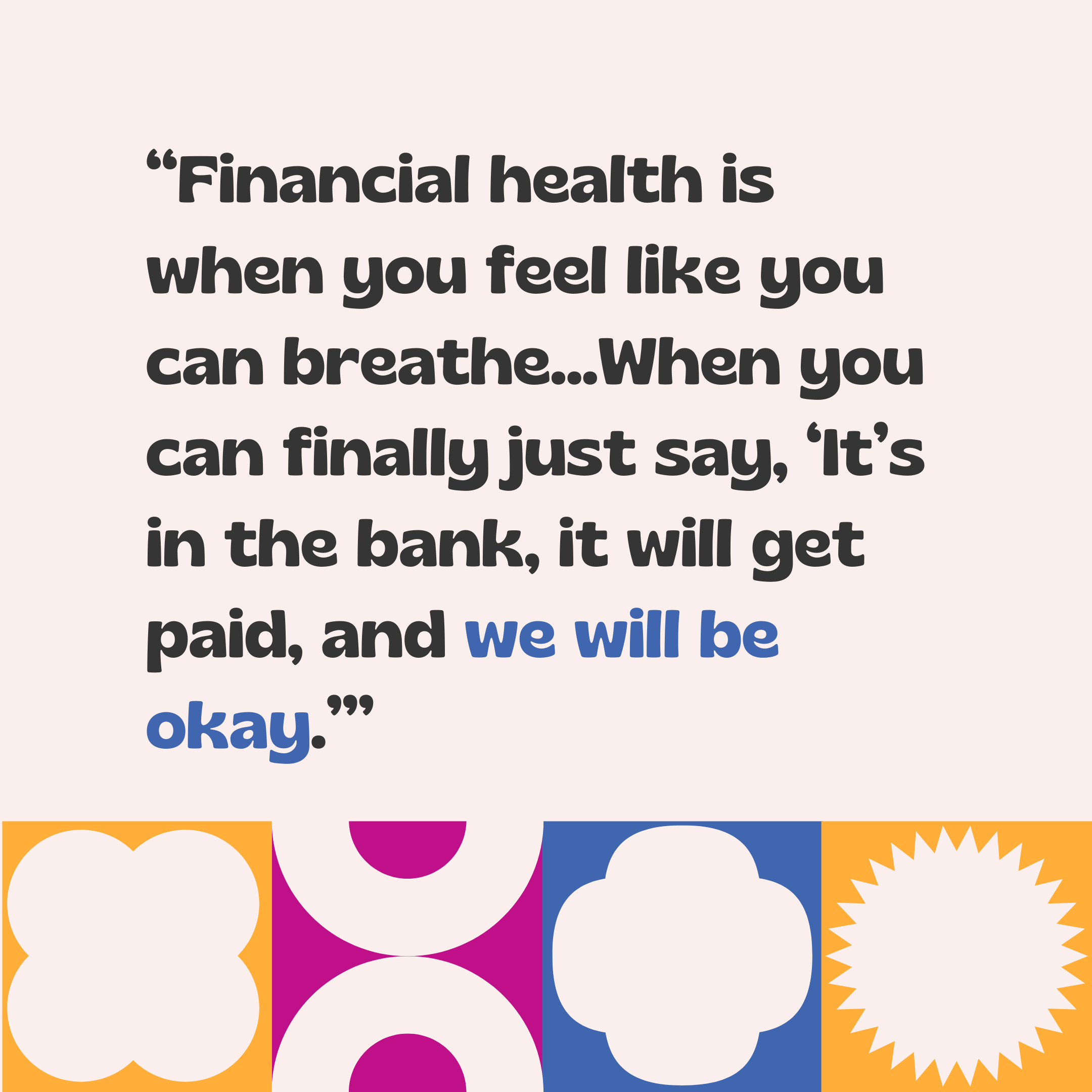 When asked what financial health looks like to her, Katelynne says that it’s knowing that you can breathe easy when bills are due. As someone who’s constantly shifting money around to ensure that every bill is covered, she sees financial stability as being able to automate the payment process and trust that it will all go through. “Financial health is when you feel like you can breathe…When you can finally just say, ‘It’s in the bank, it will get paid, and we will be okay.’”