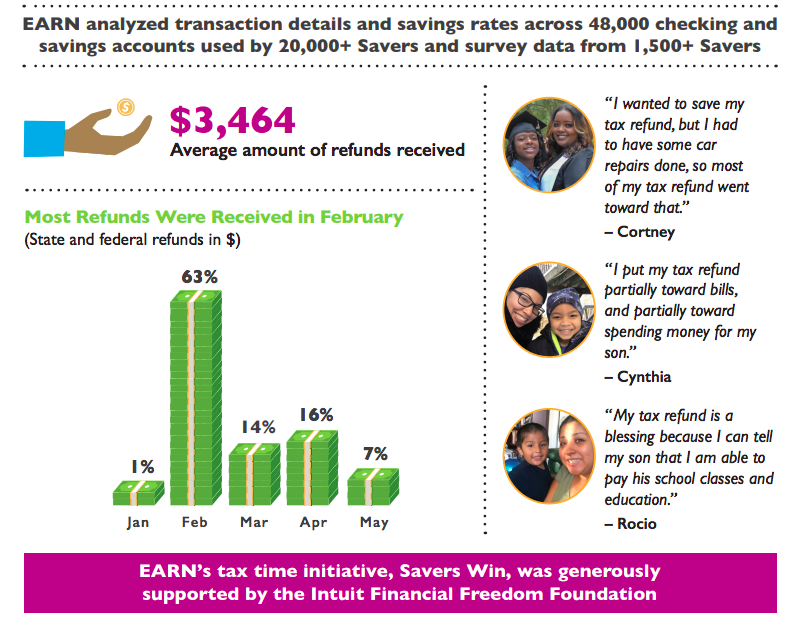 Many of EARN’s Savers, like the families in The Financial Diaries research, report that they are saving for “soon,” which accounts for much of the post-tax dip in savings and checking account balances. EARN is still researching to understand the complete tax-savings and spending picture.